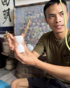 I can hear the soft rhythm of wooden blocks echoing in my mind as I gaze upon Đoàn Văn Tới’s silk paintings. Misty, calm, and meditative — his work breathes with a calmness that mirrors his own diffident presence. Tới’s art is not merely visual, it is a gentle whisper of his inner world, a reflection of his Zen Buddhist practice.